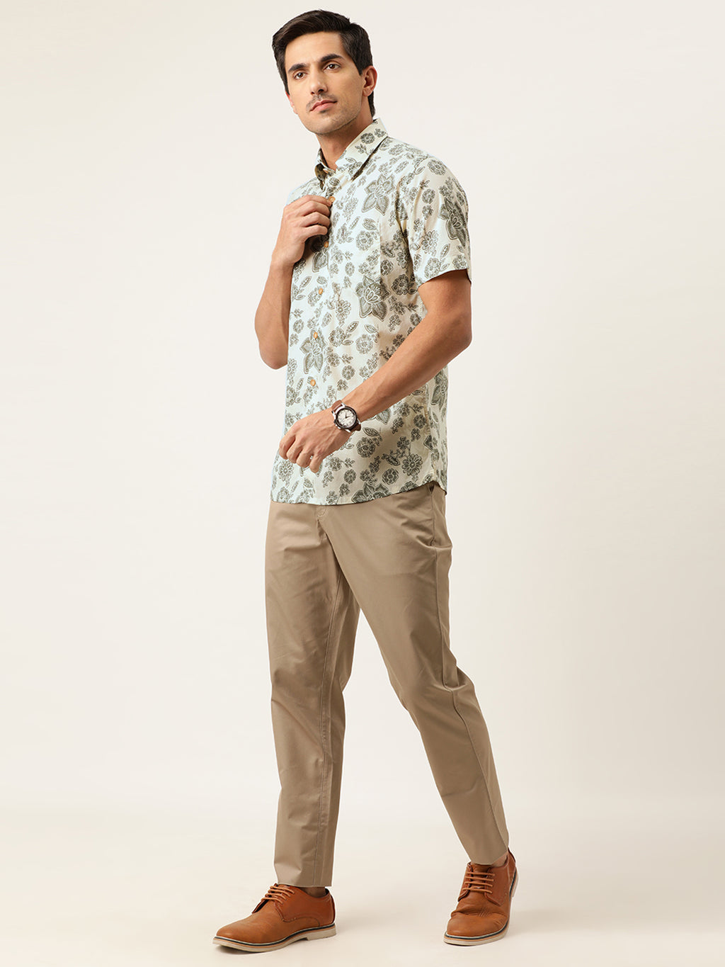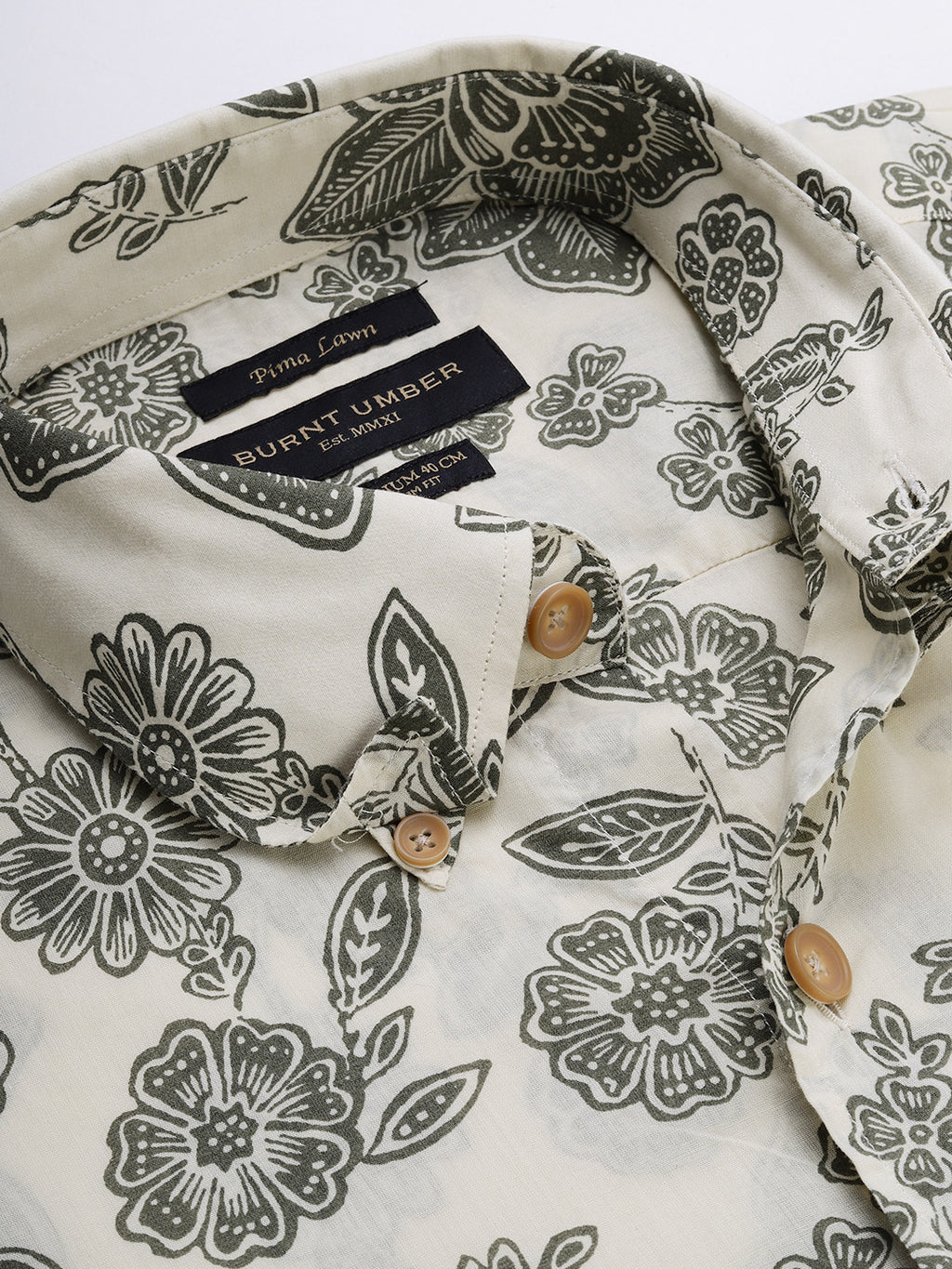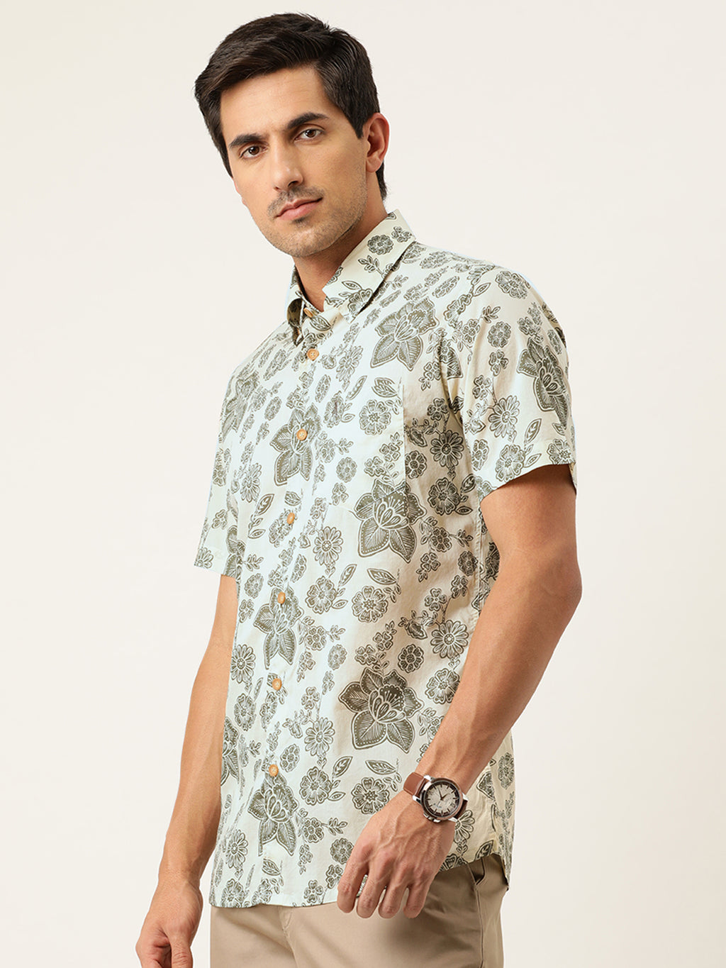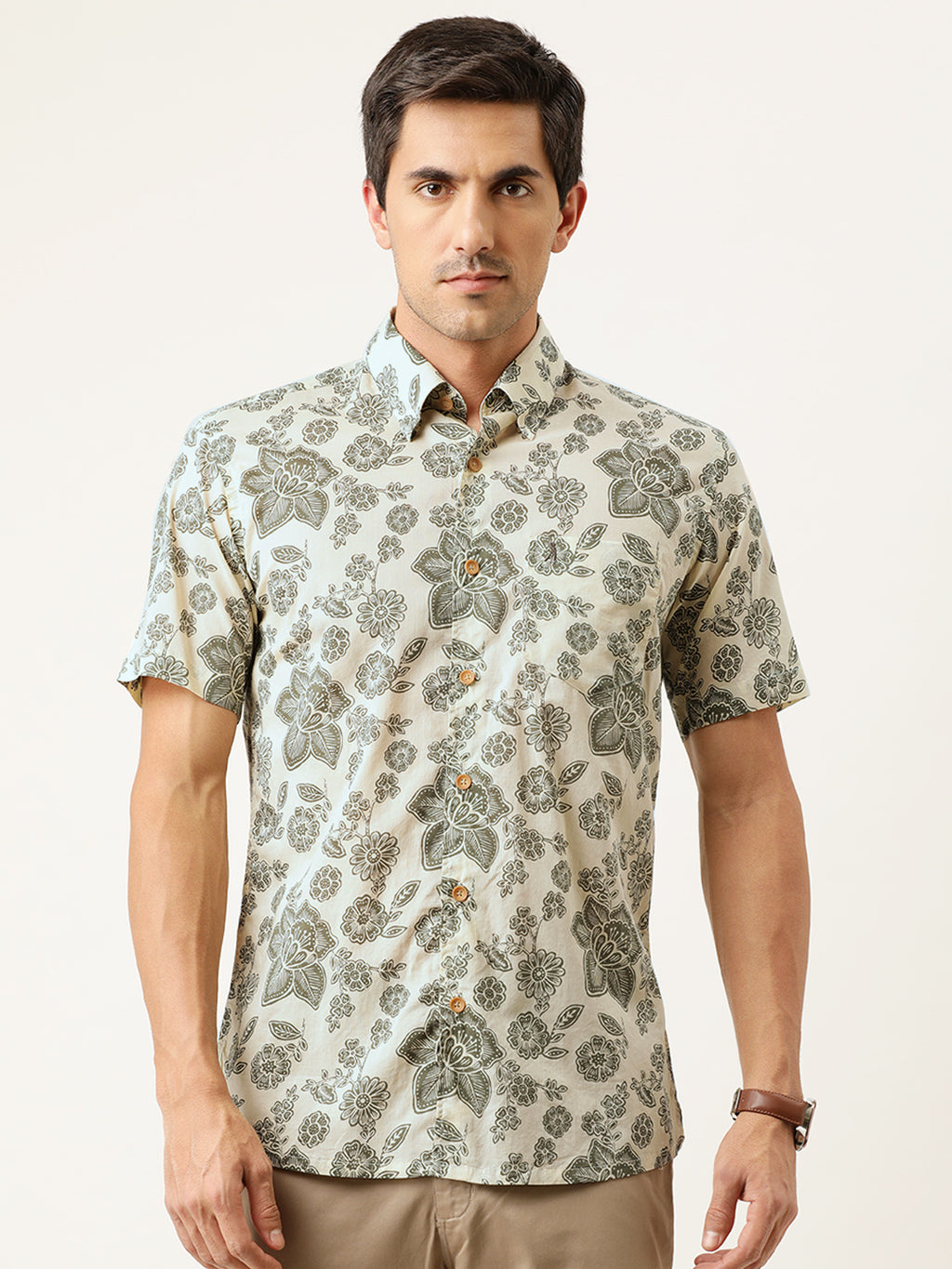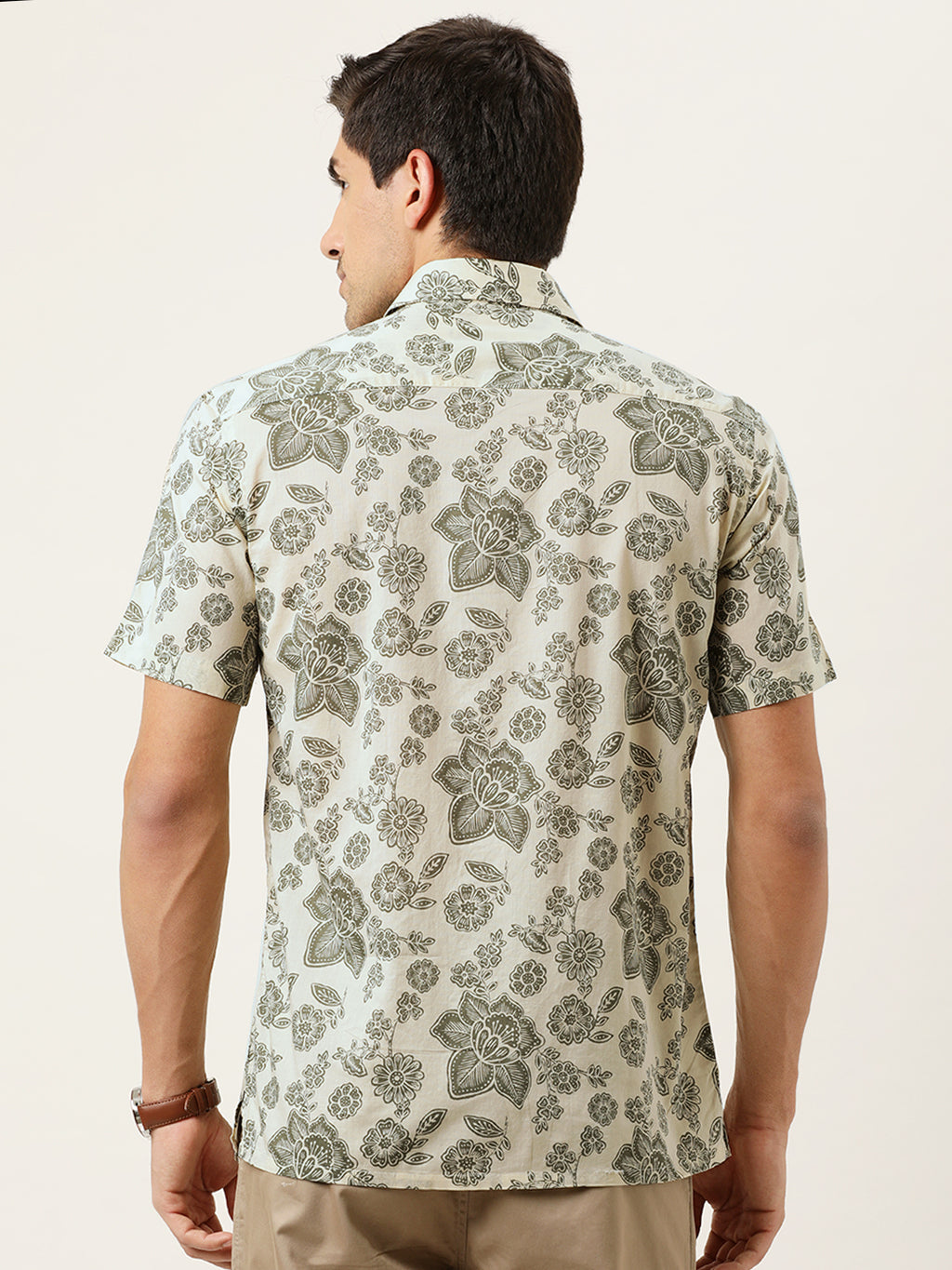 Beige Olive Floral Printed Cotton Half Sleeve Shirt